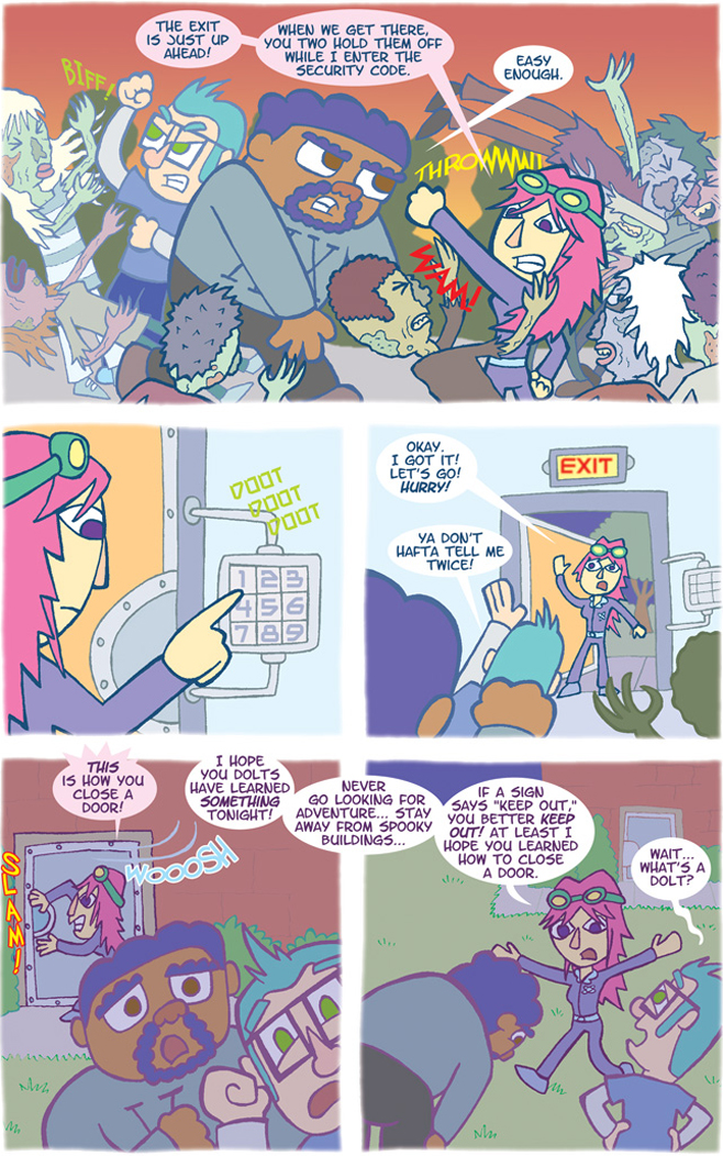 Valerie gives some really good advice that we should all consider if we want to live a safe and healthy life. She also calls the guys “dolts.” When I was developing and working on FLABBERGAST, I read a lot of Silver Age comics, and they love the word “dolt.” I had to use it somewhere.