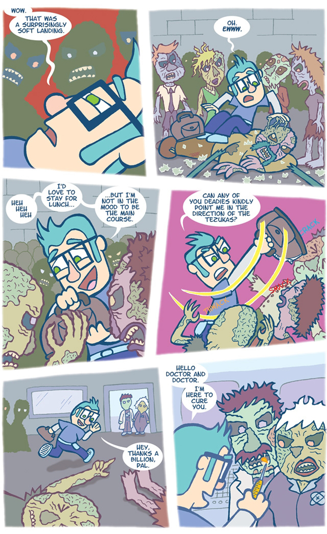These zombies aren’t that bad at all. Actually, they’re quite helpful – one being a crash cushion for Lincoln’s skylight fall, and another one pointing him to the Tezukas. Things are looking up for Lincoln. That can only mean one thing: Something’s going to go wrong.