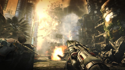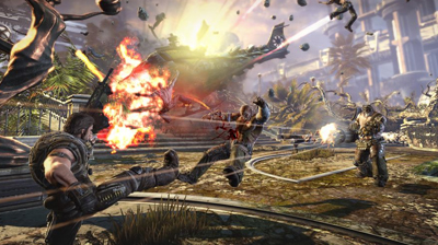 Abandoned resort planet setting aside, Bulletstorm’s essence also makes it a perfect vacation game. Much like Just Cause 2 (a holiday of pure chaos, with grappling hook) or Super Mario Sunshine (the epitomy of Summer-y bliss in game form), when you’re given time to ease into Bulletstorm’s mechanics you’ll find a refreshing break from the standard FPS model. (For one, you might’ve missed in the demo reel that your points are the key to replenishing ammo and getting new, comically destructive weapons, so you’d damn well better learn how to “kill with skill,” as the slogan goes.)