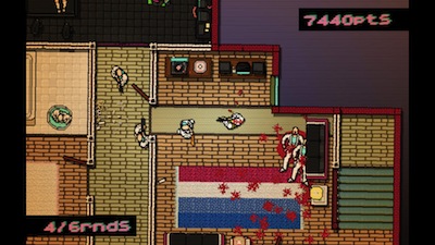 Projected onto the wall, huge and pulsating: Hotline Miami.