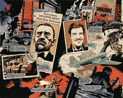 The Black Beetle: No Way Out #1 is a gorgeous and compelling comic book. Francesco Francavilla’s heavy inks and autumn color palette pull the reader into Colt City’s underworld like two bruised and calloused fists grabbing you by the shirt collar. The world Francavilla builds with his writing and panel design evokes a nostalgia for big cars, giant Zenith radios and glass-jawed gangsters. The Beetle himself has a car reminiscent of Batman’s original ride (pre-Batmobile, Dear Reader), a nifty dart pistol, stylish goggles and of course, a helicopter strapped to his back! The Black Beetle takes me back to that first image I saw of The Shadow – his guns drawn and his coat flowing in the wind – and Colt City screams the same kind of lurid danger.