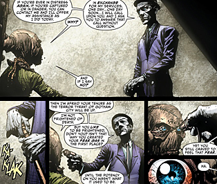 My only complaint about the book is David Finch’s art. Because Johns has so much storytelling occurring in this issue, Finch uses small panels, which do not flatter his style at all. Characters often look blurry and chalky. The inks fail to give characters clear outlines, so they often blend into the panel without any real definition. Close-ups are a bit better, as they encompass more detail and better showcase Finch’s abilities. But these rarely occur and the lack of clarity distracts from the storytelling.