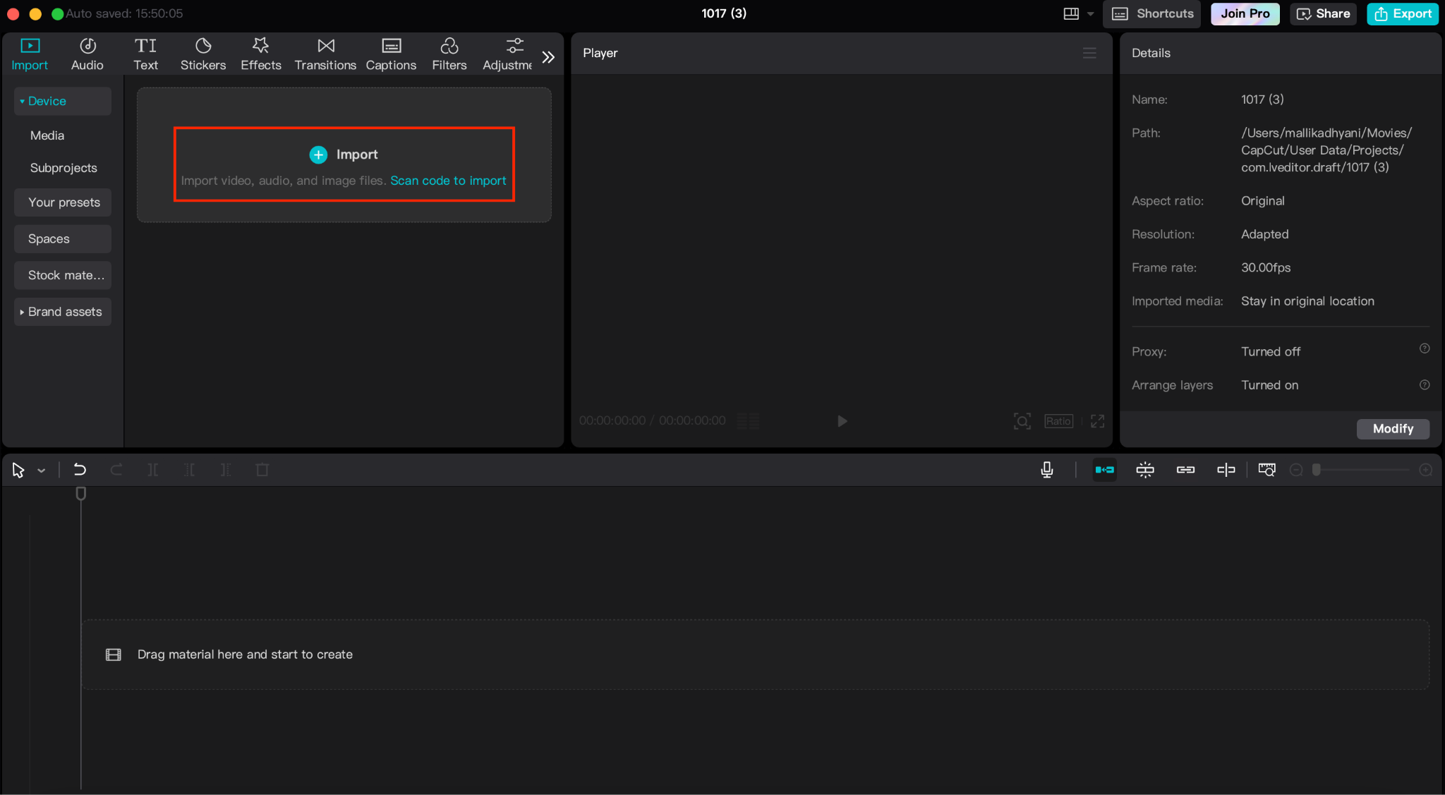 Start by uploading your video file into CapCut’s desktop editor. You can drag and drop your file onto the timeline, making sure it’s ready for captioning.