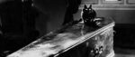 The black and white cinematography lends itself to the sinister mood of the film, whether in the spooky forest, the run-down central courtyard of the Sycamores, or the moldering library where books mysteriously fall off shelves at dramatic moments.