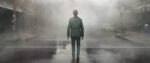 A still from Return to Silent Hill shows a woman with her arms and legs bent at unnatural angles stands beneath the arch of an overpass on a gloomy, foggy day.